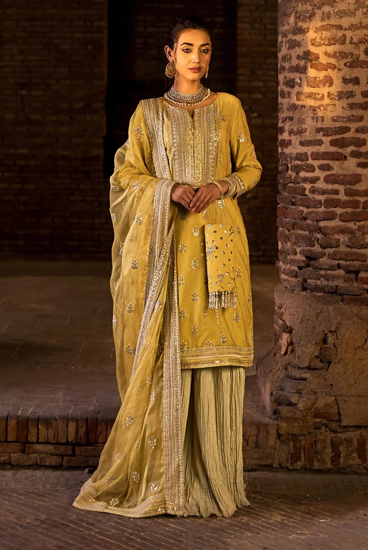 Erum Khan's Dil Araa collection showcases exquisite craftsmanship in premium raw silk, featuring intricate embroidery work across three coordinated pieces. This unstitched ensemble allows for personalized tailoring to your exact measurements and preferences. The luxurious raw silk fabric drapes elegantly while maintaining its natural texture and breathability, ideal for formal occasions and celebrations. Each piece displays meticulous embroidered detailing that reflects traditional artistry combined with contemporary design sensibilities. Perfect for those who appreciate bespoke tailoring and high-quality textiles, this collection offers versatility in styling while ensuring a sophisticated, custom-fit garment.