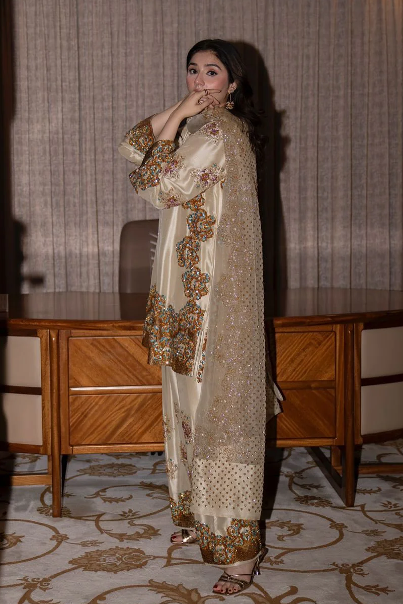 Introducing an exquisite piece from our Wedding Collection—a masterfully crafted ensemble that seamlessly blends luxury materials with traditional artisanal techniques. This beige creation features premium lamb's wool in a rich crème tone, complemented by sumptuous raw silk that drapes with natural elegance. The standout element is the intricate addawork hand embellishment, a time-honored embroidery technique that adds sophisticated texture and visual depth throughout the garment. Each stitch reflects meticulous craftsmanship, making this piece ideal for discerning brides and wedding guests seeking refined, statement-worthy attire. The harmonious combination of soft, breathable fabrics ensures comfort without compromising on luxury, while the neutral beige palette offers versatile styling possibilities. A truly distinguished choice for those who appreciate fine textiles and exceptional artisanal detail.