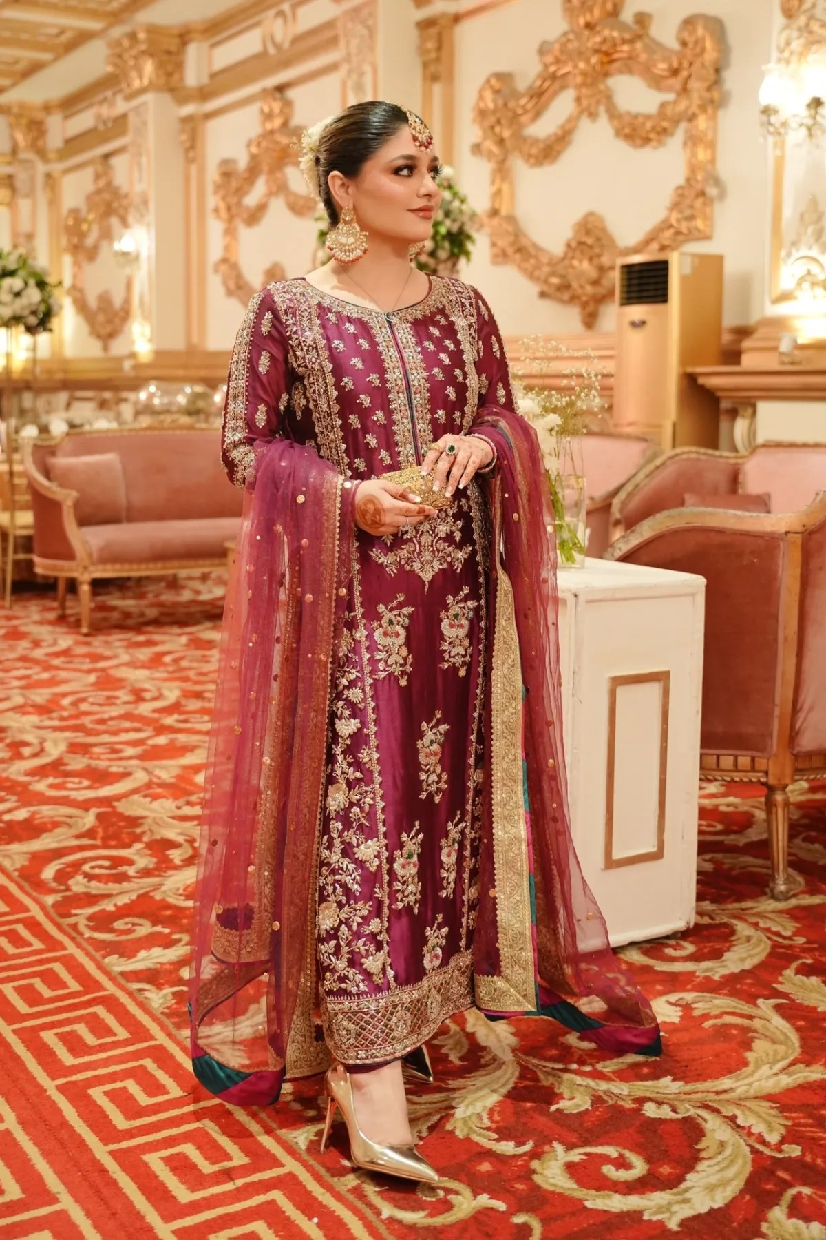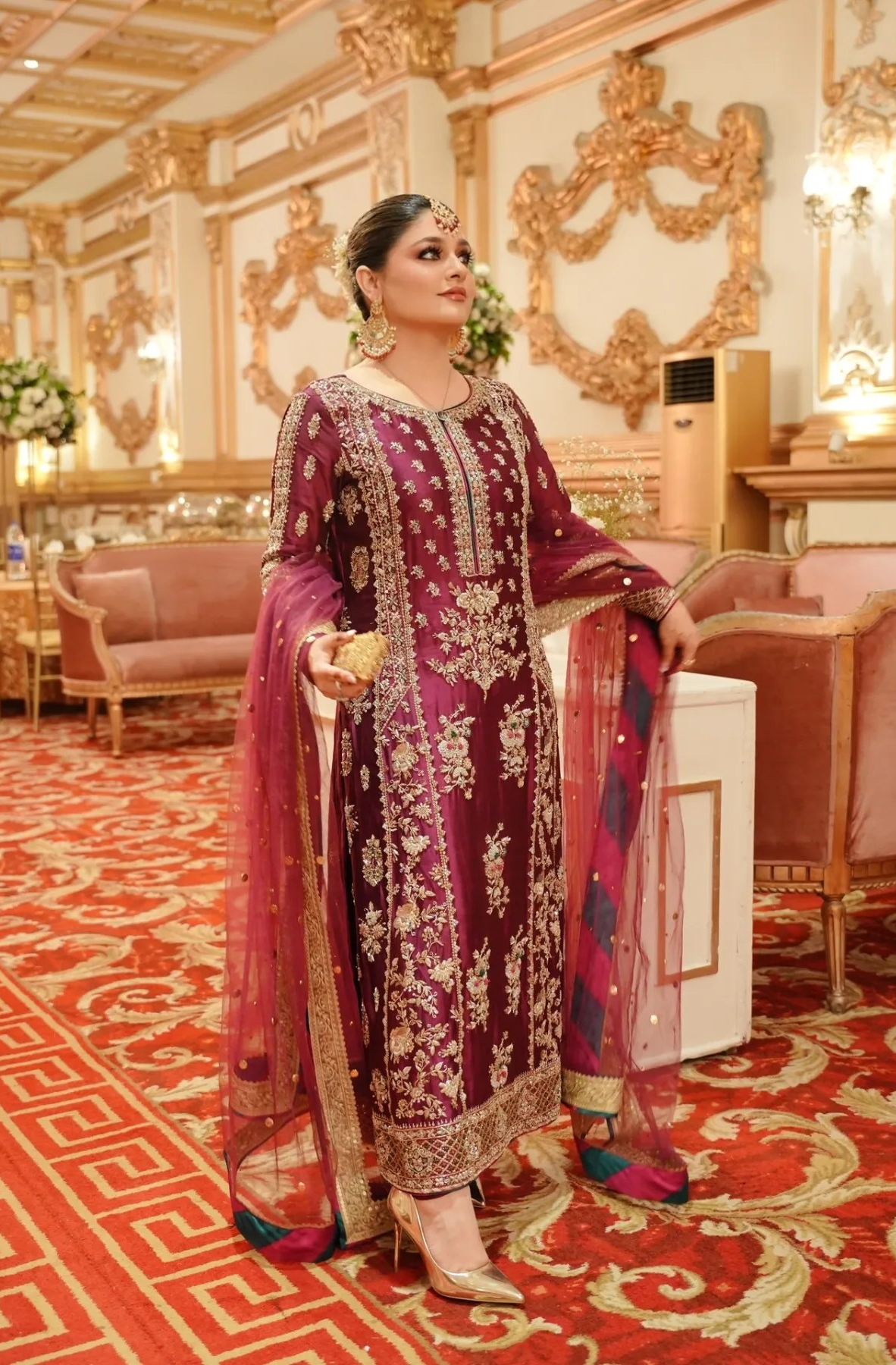 Product Description: A deep maroon ensemble adorned with intricate silver thread work and delicate floral embroidery. The luxurious fabric flows gracefully, enhanced by detailed patterns that reflect classic Eastern craftsmanship. Flattering straight cut with full sleeves and a round neckline, this design strikes the perfect balance between traditional charm. The embellished borders and rich embroidery make it an ideal choice for festive occasions, weddings, or formal gatherings