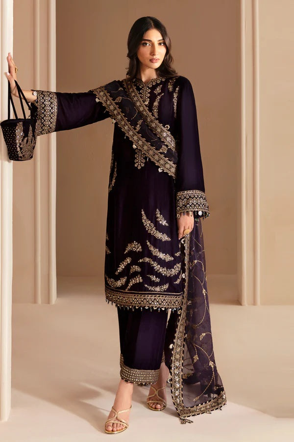 Elevate your formal attire with our Embroidered Velvet Formal VF-2025. Crafted from pure velvet, this exquisite piece features embroidered detailing on the front, sleeves, bottom, and dupatta border for a luxurious touch. The rawsilk dupatta and georgette chiffon dupatta add to the elegant design.