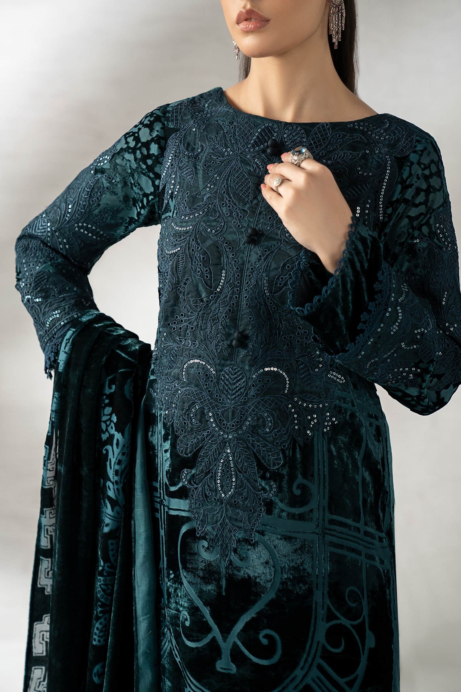 Elevate your wardrobe with this exquisite three-piece unstitched ensemble from Maira.B's luxury collection. Crafted from premium velvet, this palachi set features intricate embroidery work that showcases refined craftsmanship and timeless elegance. The rich teal hue offers versatility for both traditional and contemporary styling. As an unstitched piece, it provides complete customization freedom to tailor the fit and silhouette to your preferences. Perfect for special occasions, celebrations, or adding a touch of sophistication to your everyday collection. Experience luxury that speaks to discerning taste.