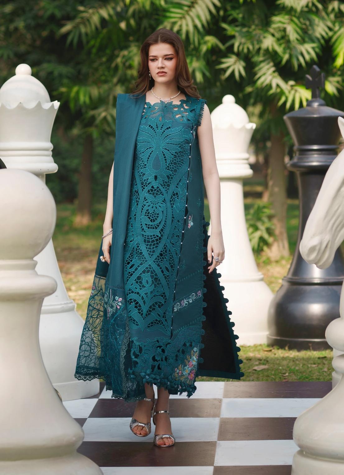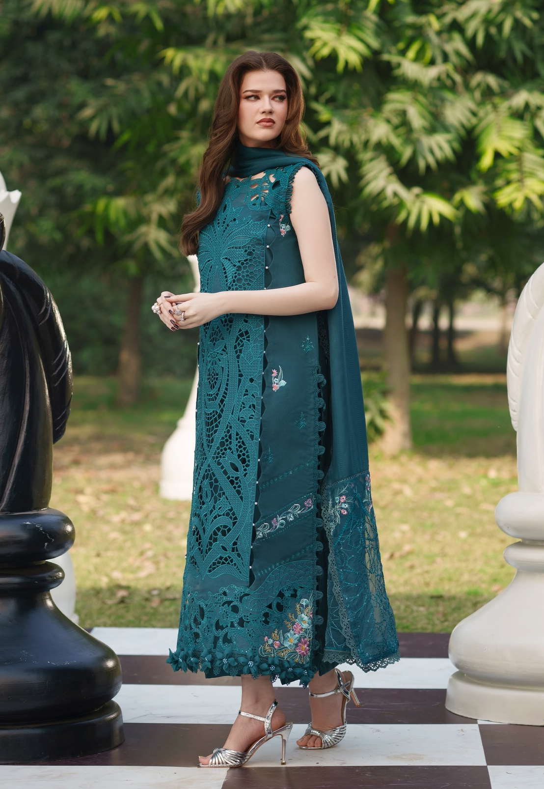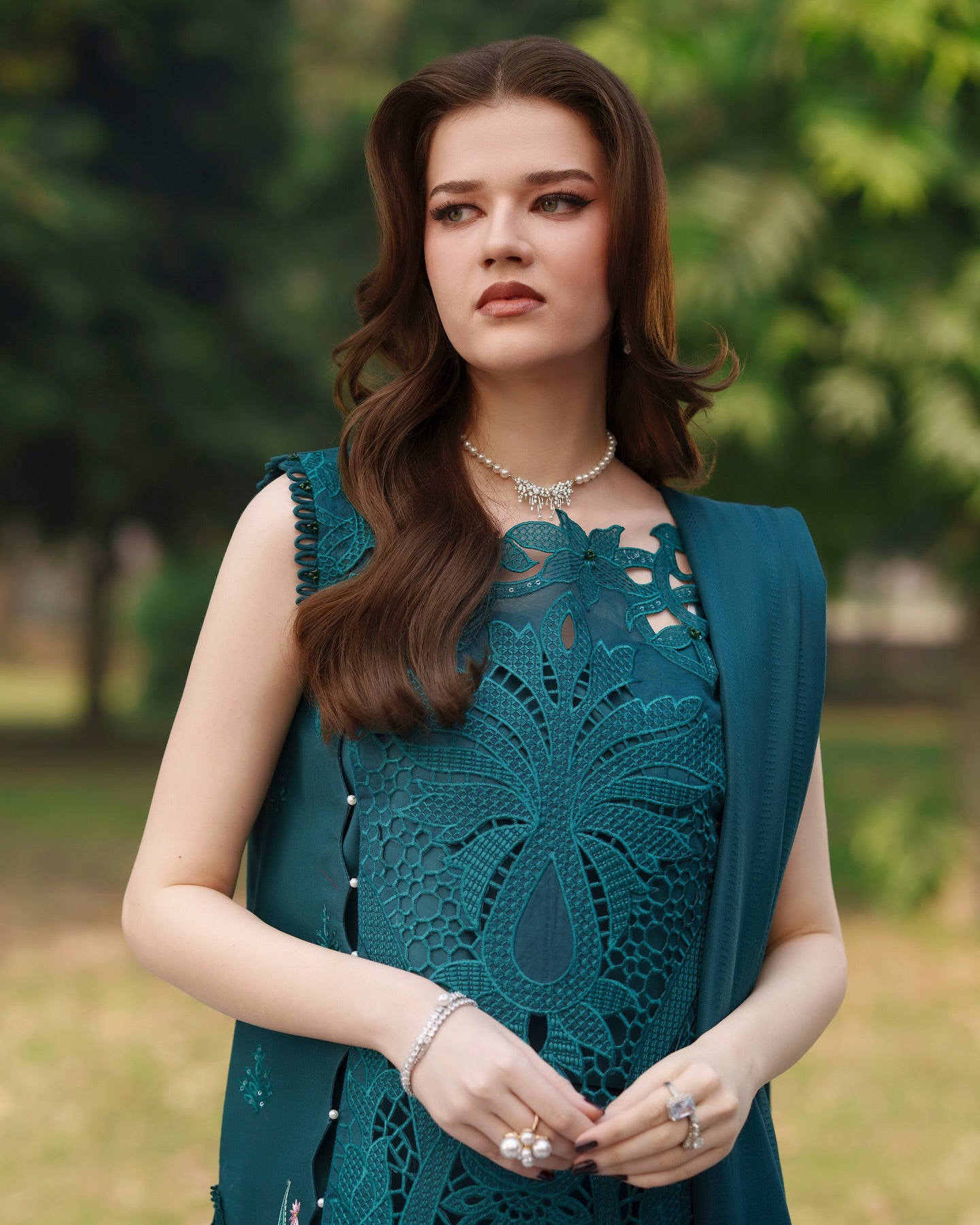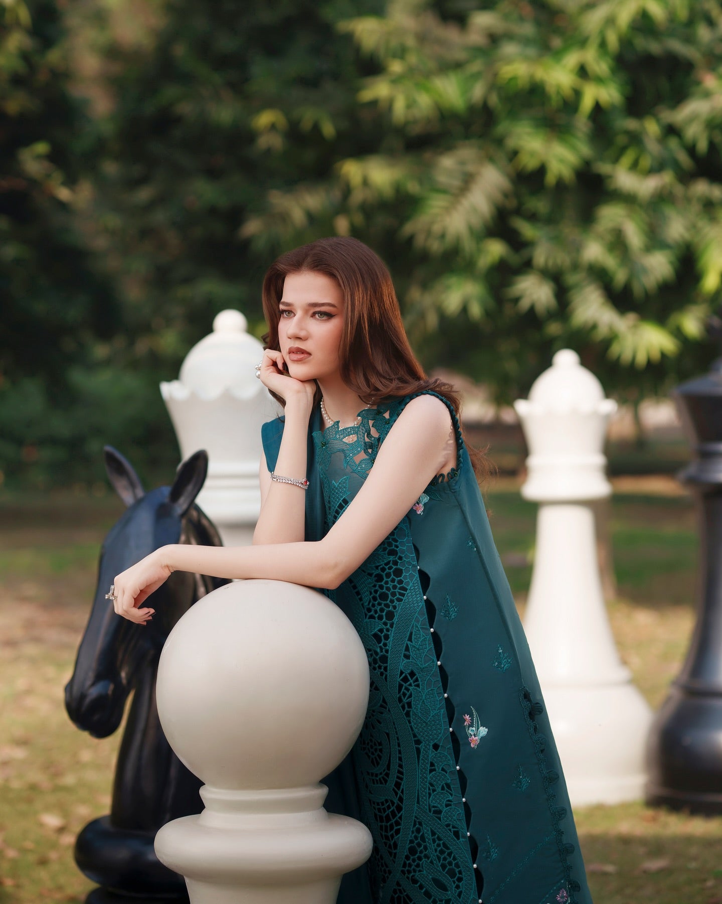 A deep teal lawn outfit made for women who lead with quiet confidence. The article has cutwork embroidery which gives the look a bold but graceful feel.