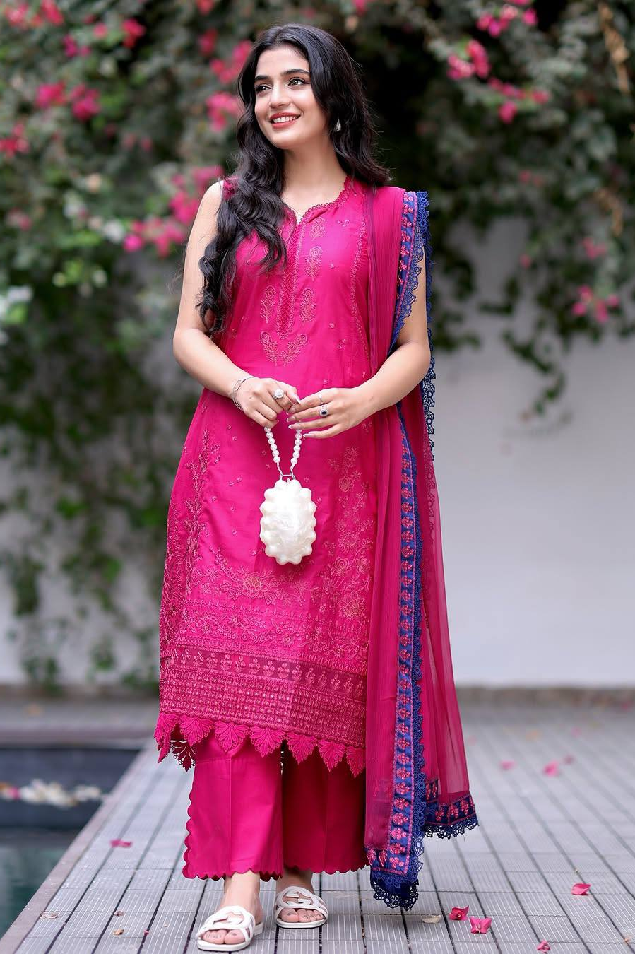 Experience timeless elegance with this Republic Womenswear luxury lawn suit, expertly crafted for the discerning woman. The three-piece unstitched ensemble features intricate embroidery work in a striking shocking pink hue that commands attention. Premium lawn fabric ensures breathability and comfort, while the unstitched format allows complete customization to your preferred fit and silhouette. Perfect for formal occasions, celebrations, or everyday sophistication. Elevate your wardrobe with this statement piece that seamlessly blends traditional craftsmanship with contemporary style.